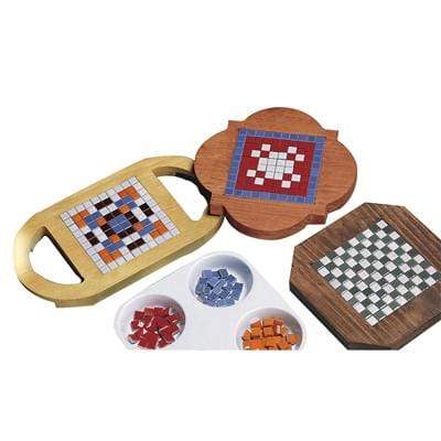 Tiny tiles fit on flat surfaces without grout or spacing problems. Base shape allows evaluation of the quality of sanding and staining. Tile designs match the complexity of each base. Good for groups of 6 short-term stay patients. Kits include assorted bases, presorted tiles and sandpaper. Order stain, brushes, bins and glue separately. Tiling area: 4-1/2" ...Show more