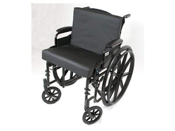 Features and Benefits: Combines a foam wheelchair cushion with a back cushion. Individual channel cuts throughout provides ultimate pressure redistribution. Contoured back design will help with lumbar support. Stretch nylon...