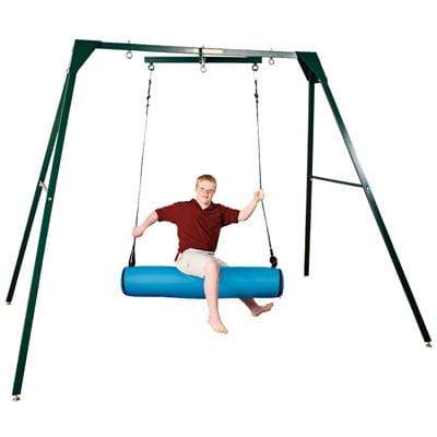 This A-Frame, which offers all the benefits of a ceiling suspension system, comes with everything needed to get kids moving. The free-standing steel frame is durable and allows for the suspension and use of a variety of therapy swings without causing damage to walls or ceilings. This total package offers a wide variety of sensations and experiences for users. It includes a 360° vertical rotation system for simultaneous vertical/horizontal stimulation. The set includes the frame, 4-point spinner, log swing, circle platform swing, flying saucer swing, therapy net swing with board, vertical bouncer, 2 height adjustment systems, 2 safety rotational devices, 4 safety snaps and 10' x 5' rainbow mat. The various elements of this set work together to offer a multitude of benefits. The versatile padded horizontal bolster log swing enables creating a variety of progressive balance and core exercise activities. The vertical bolster on flying saucer swing provides an intense sensory challenge. The therapy net swing with board provides linear and rotational movement to enhance core development and motor control. For indoor use only. Assembly is required. Fully assembled, the A-Frame ends up sized at 12'10"L x 6'6"W x 7'6"H. The frame has a capacity of 500 lbs. and can support a 300 lb. working load. The four-point spinner features a 360° vertical rotational device for smooth unrestricted movement and is usable with a variety of swings. Vertical Bouncer Kit is designed to enable controlled bouncing and vestibular stimulation with any therapy equipment attached to it. The rainbow mat, which has panels of red, blue, green, and yellow, is shock absorbing to help ensure any falls or tumbles have minimal impact.