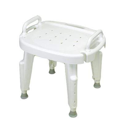 Adjustable Shower Seat with Back, No Arms. Shower seat with removable back and arms assists in sitting or standing and makes personal hygiene easier. Features height adjustable legs (16-21"), suction feet and a built-in hand held shower spray holder. Supports up to 300lbs. Durable and rust proof.