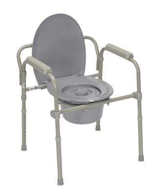 Easily opens and folds. Folds flat for convenient storage and transportation. Durable plastic snap on seat and lid. Assembles without pushing buttons. Grey powder coated steel welded construction increases strength and durability. Removable, tool free back. Plastic arms for added comfort. Comes complete with 12 qt. commode bucket with carry handle, cover and splash shield. Height adjusts from 16.5 - 22.5". Weight capacity is 350 lb.