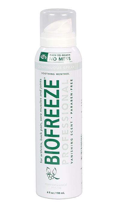 BioFreeze pain relief is available with gel-roll-on and spray applicators. It contains an ILEX base, and an herbal extract for a quick onset, long lasting, pain relief. The pain relief formula is greaseless, stainless, and has a vanishing scent. Lightly massage BioFreeze into all sides of sore muscles. Use to relieve pain from sore muscles and muscle spasms, back, shoulder, and neck pain, arthritis, painful ankle, knee, hip and elbow joints, and muscle strains. Use to relieve pain prior to massage therapy, soft tissue trigger point therapy, rehabilitation exercises, and pre and post workout stretch. BioFreeze contains menthol. BioFreeze CryoSpray - 4 oz patient size