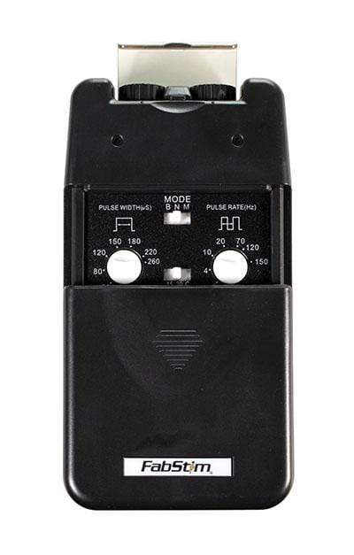 The FabStim analog unit uses a microprocessor, which gives exact dial performance. Benefits includes maximum full strength power of 80 mA. The safety amplitude cap protects the amplitude knobs from accidental bumps or knob movements. System includes device, lead wires, four self-adhesive reusable electrodes, 9V battery, hard plastic carrying case and instruction manual. Power Source: 9-volt battery. Modes: Standard, Modulate and Burst. Channels: Dual. Timer: 30 and 60 minutes or continuous. Pulse Width: 50-250 Microseconds, Adjustable. Pulse Rate: 2-150 Hz. Pulse Amplitude: 0-80 mA each channel. Waveform: Asymmetrical biphasic square pulse. One year warranty.