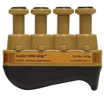 The CanDo Digi Grip strengthens the user's fingers, hands and forearms. Use each button independently to exercise fingers and develop isolated finger strength. Compress the entire unit for complete hand and forearm strengthening. Use it to increase flexibility and coordination for music, sports, fitness, and rehabilitation programs. Each finger button can individually lock. Progressive color-coded resistance gives patient positive feedback. It comes gold in color and is xxx-heavy in resistance.