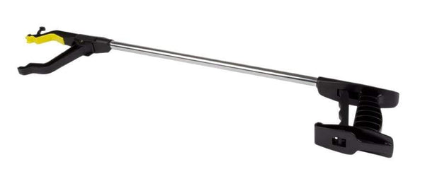 Lightweight reacher has an ergonomic trigger that is operated with whole hand. It is constructed with wired-driven jaws and the frame resists twisting and bending. It includes magnet for picking up metal objects and a hook to aid with dressing. These reaching aides assist individuals with limited reach and hand strength.