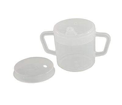 PSC Cups come in a variety of handle configurations and each comes with two versatile, specialty lids. Cups and mugs have up to 8 ounce capacity. Useable with or without antisplash lid. Dishwasher safe plastic. The anti-splash lid helps direct liquid into mouth and can be used with a straw. The spout lid fits comfortably in mouth and the flow of liquid can be regulated by placing a finger over hole.