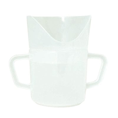 Designed with a nose cutout to encourage correct head position. Allows user to drink with little or no shoulder flexion, wrist extension or head/neck movement even when wearing a cervical collar. Dishwasher safe plastic.