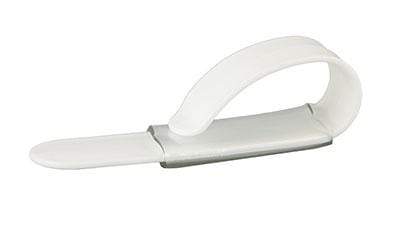 An excellent eating aid for people who have trouble grasping and holding small utensils. This spring-action plastic clip fits the hand snugly without pinching.