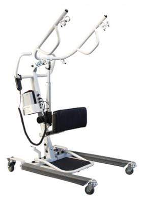 Patients must be able to actively participate in the lifting process and be able to partially support their weight. • Heavy gauge steel construction with white powder-coated finish and rubber-coated low base legs protect furniture and walls • Spreader bar provides various hand-hold locations for the patient and accommodates various sling slyles • Large, easy to grip handles for easy maneuverability • Intuitive foot pedal leg opening mechanism frees up hands • Adjustable knee pad unit • Quick-release removable foot platform for gait training • Ergonomic hand pendant with hook • Emergency stop button • Warning beep and visual indicator on control box for low battery charge (24V DC motor) • Accessory storage bag and how-to-use video included • Designed to meet the requirements of HCPCS Code E0635 Warranty: Frame and spreader bar: Three (3) year limited Actuator: Two (2) year limited Batteries: One (1) year limited |