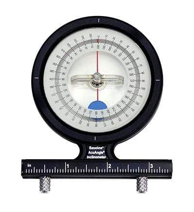AcuAngle Inclinometer with adjustable feet is used to measure range-of-motion (ROM). Standards are codified in the AMA Guide to the Evaluation of Permanent Impairment, third edition. Place inclinometer near joint to be measured; turn dial until scale reads 0; take joint through its range; read range traveled directly from dial. Adjustable feet along scale (side-to-side) adapt to body contours. Some neck and back measurement protocols require the simultaneous use of 2 inclinometers.