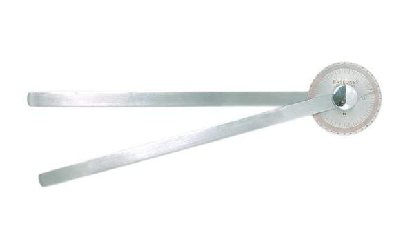 A goniometer measures range-of-motion (ROM) of various joints. The 360° head is marked in 1° increments. Tension between the arms is controlled by the thumb knob.