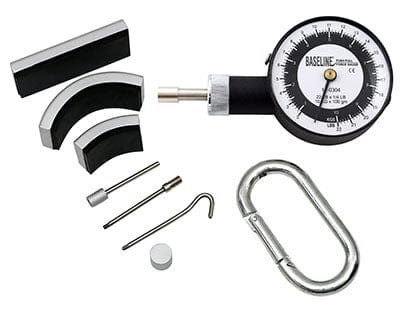 The Baseline mechanical push-pull dynamometer is a simple, easy-to-use, ergonomically designed instrument that objectively measures push, pull and lift forces for manual muscle testing, functional capacity evaluation and job task evaluation. Because the instrument is lightweight, small and portable, you can perform precise, objective evaluations in your office, at the client's location, or in the field. Ergonomically designed dynamometer is easy to grasp while testing small forces. The dynamometer is packaged with 3 push pads (padded curved, padded straight, and circular), 1 pull hook and 1 snap-lock hook. Comes in a carrying case. 1 year warranty. CE certified.