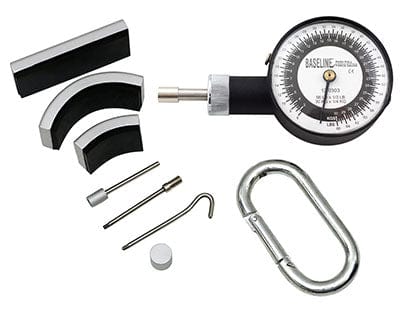 The Baseline mechanical push-pull dynamometer is a simple, easy-to-use, ergonomically designed instrument that objectively measures push, pull and lift forces for manual muscle testing, functional capacity evaluation and job task evaluation. Because the instrument is lightweight, small and portable, you can perform precise, objective evaluations in your office,  at the client's location, or in the field. Ergonomically designed dynamometer is easy to grasp while testing small forces. The dynamometer is packaged with 3 push pads (padded curved, padded straight, and circular), 1 pull hook and 1 snap-lock hook. Comes in a carrying case. 1 year warranty. CE certified.