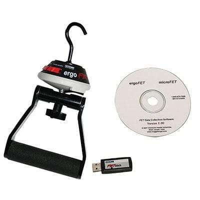 The ErgoFET Push-Pull Force Gauge is a digital force gauge designed for displaying peak force and time duration with its easy to read LCD screen. It features accuracy within 1% of reading, expanded sensitivity with its low and high threshold settings and selectable units of measure: pounds (lbs.), Newtons (N), or kilogram-force (kgf). The threshold settings start with the low threshold at 0.8 lbs. and measures at 0.1 lb. increments up to its 300 lb. high threshold capacity. This force gauge is wireless, eliminating the annoyance of cables, cords, and wires. The Wireless ErgoFET Push-Pull Force Gauge uses a rechargeable lithium ion battery with a self-activating "sleep" mode after 3 minutes of non-use to extend battery life. This cost-effective and ergonomically handheld design makes testing easier and more closely simulates actual job tasks for one hand test applications. Use as a stand-alone or with clinical software package (included) or data collection software package (included). Clinic Software Package is an easy-to-use platform providing muscle testing and spinal range of motion protocols. Patient tracking, analysis, and comparison statistics are collected and narrative and graphic reports can be generated. Data collection software package is designed for research and education applications. The program simultaneously captures raw test data while displaying a real-time graph of the data. The data is saved in comma-separated values (CSV) format and can be opened in most spreadsheet programs for further analysis.