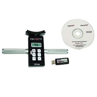 ErgoFET500 Push-pull dynamometer measures peak force, average or 3-second average force. Push and pull attachments allow for a wide variety of strength measurement tests. Use as a stand-alone or with clinical software package (sold separately) or data collection software package (included). Data collection software package is designed for research and education  applications. The program simultaneously captures raw test data while displaying a real-time graph of the data. The data is saved in comma-separated values (CSV) format and can be opened in most spreadsheet programs for further analysis.