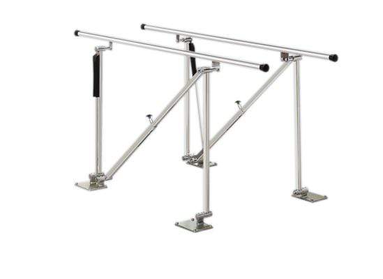Single Operator Adjustable Parallel Bars are Floor Mounted. One person can change these bars faster than any other manually adjusted bars. A practical alternative to motorized bars. Every height adjustment necessary can be made from a single location. Durable, safe and very simple to use with height and width permanently stamped on frame. Single plunger/lock.  Handrail size 1-1/2". Height adjusts from 31" to 41" H. 22½"W between handrails.