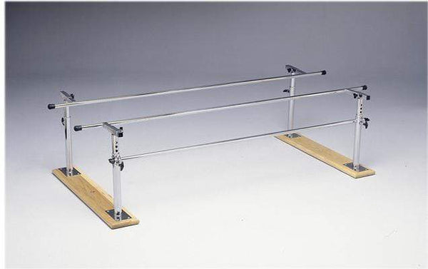 These sturdy and stable folding parallel bars with a 42" base require only 14" of floor space when not in use. Wood base unit comes with one stabilizing bar to lock parallel bars in open position. To store the space saving bars, simply unlock and slide until handrails are nearly touching. Add 3 feet to length when folded. Length 7'. Wood base is 42"L x 7"W x 1¼"H". Steel base is 42"L x 5"W x ¼"H. Height adjusts from 22" to 36" H. Width adjusts from 16" to 24" W. Hand rail size 1-1/2" diameter. Can be used with optional Model 90 Divider Board. Allows wheelchair access with a distance of 31 1/2" clearance between posts. Optional Divider board: 15-4037.