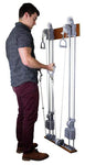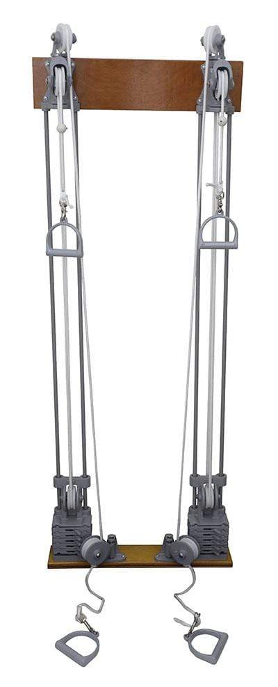 Chest pulleys are an important part of many rehabilitation programs; these pulleys come with handles, weights, hardware indicated. The handle is mounted at chest height on single handle unit; chest and floor height on double handle unit; and chest, floor and shoulder height on triple handle unit (ceiling height of 10 feet is needed for triple handle); choose from single or dual tower set-ups. Simply select the weight level by inserting "pin" into weight stack at increments of 2 pounds. Exercisers are wheelchair accessible. The handles can be adjusted to any starting height; adjust the rope slip to lengthen or shorten the pulley rope. Additional weights and handles available.