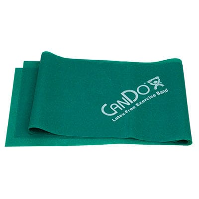 CanDo resistive band exerciser is packaged in a polybag. Simply remove exercise band from polybag and it is ready to use. CanDo high quality synthetic latex-free exercise band has been used for physical therapy and athletic training by clinics, fitness centers and individuals since 1987. It has become a well known staple of many physical therapy programs. The latex free formula has been specially created to mimic the stretch characteristics of latex band. CanDo exercise band is an economic solution for upper and lower body exercise. Lightweight, compact and portable. Durable. Effective when used alone, or with handles and anchors. Color-coded according to the exercise band's resistance. CanDo is licensed to use the Thera-Band color sequence so resistance level is easily identified. Available in 8 levels of resistance for progressive exercise. Levels range in order of resistance from least to greatest resistance: tan, yellow, red, green, blue, black, silver, gold. Uniform width - each band is 5" wide.