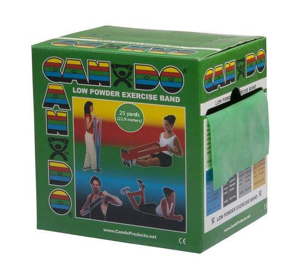 CanDo Rolls of Exercise Bands are perfect for rehabilitation, fitness, physical therapy and athletic training. Additionally, they are great for anyone using them for stretching, muscle toning, improving balance and conditioning all major muscle groups. Packaged in a dispenser box, simply unroll the desired length of exercise band from the box and cut with scissors. The CanDo Exercise Band is the premium exercise band solution, containing natural rubber Latex and all the functionality, stretchability and benefits that come with it. So versatile, these bands are super for upper and lower body exercises that are simple, easy to do and can be performed anywhere. Lightweight, compact and portable, the high quality and superior characteristics of these bands are why they are used in physical therapy and athletic training by clinics, fitness centers and individuals nationwide. This is a 25-yard roll of the Green (Medium) Band. Exercise bands are effective when used alone or with handles and anchors. Made with natural rubber Latex which may cause allergic reactions. They are a well-known staple of most physical therapy offices, clinics and gyms because they are durable, powderless and textured for easy gripping. The 25-yard rolls can be used in all dispenser systems/racks. Bands are available in 8 levels of resistance for progressive exercise. Levels range in order of strength from least to greatest resistance: tan, yellow, red, green, blue, black, silver, gold.