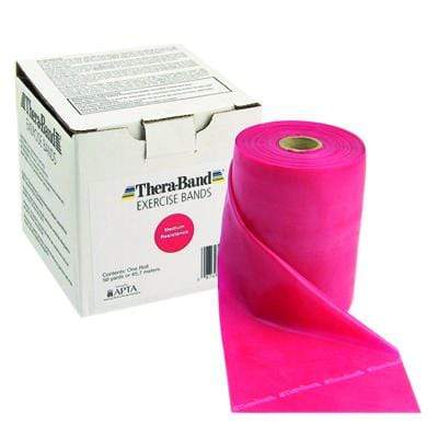 TheraBand latex exercise band can be used independently or as part of a progressive exercise program. Band is 5" wide. Available in 6 and 50 yard rolls, 100 yard put-ups, and dispenser boxes of 30 x 4-foot pieces.