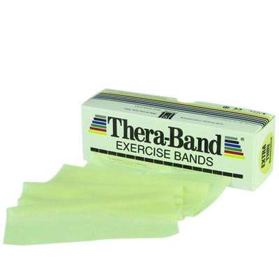 TheraBand latex exercise band can be used independently or as part of a progressive exercise program. Band is 5" wide. Available in 6 and 50 yard rolls, 100 yard put-ups, and dispenser boxes of 30 x 4-foot pieces.