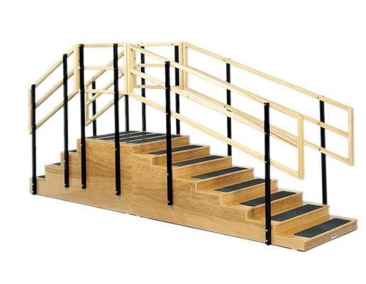Convertible Exercise Stairs consist of two sections which lock securely together and CANNOT be unfastened accidentally. Stairs may be easily converted from a straight line along a wall to a right angle. Anti-slip safety treads on each step and platform. Furnished with hardwood handrails at heights of 18-1/2", 27" and 35" hight to accommodate both children and adults. Each stair section has vertical supports of angle iron, with sprayed black finish. All bolts and nuts are plated. Overall height 54". Height to platform 24". Long section 5'10". 30" wide, 4 and 8 steps. 3" x 10" and 6" x 10" risers. 500 lb weight capacity.