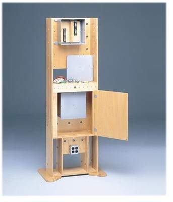 This stand alone center simulates multiple job tasks and assembly activities that can range from simple to complex. This unit also encourages whole body range of motion and working in confined spaces. 22 1/2" wide x 10" deep x 72" high. 28" wide x 20" deep base. Basic electrical supplies included (as shown). Natural finish. (Please do not wire unit with live current),